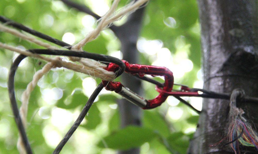 Om de regen en onweer voor te zijn, beginnen we direct met het opspannen van touw en lijnen. De twee tarps overlappen elkaar en bieden zo een groot stuk beschutting. Op dezelfde hoogte hangen we onze hangmatten op. Van te voren meet ik met stappen uit of de berken niet te ver van elkaar af staan. Ik tel zeventien stappen. Perfect om mijn hangmat tussen te hangen. Al snel hebben we ons kamp opgetuigd.
