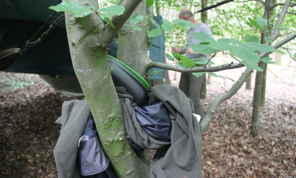 De beuken staan midden in het bos al een cirkel bij elkaar. Ze bieden extra beschutting tegen de regen en ontnemen het zicht. De dikte van de stammen zijn uitermate geschikt voor onze hangmatten en voor het opspannen van de tarp. Klein maar tegelijk groener dan groen, is dit kleine beukenbosje midden in het grotere bos, ons thuis voor vannacht.